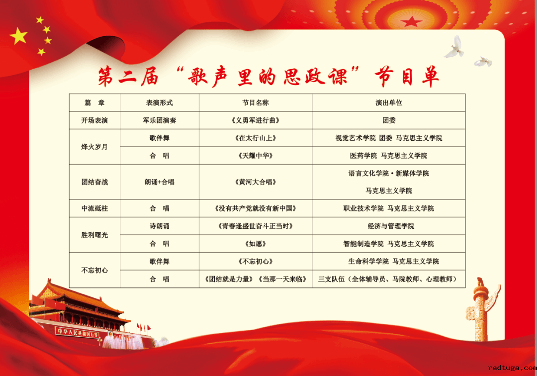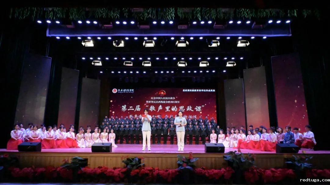 第二届“歌声里的思政课”包含“烽火岁月、团结奋战、中流砥柱、胜利曙光和不忘初心”五大篇章。思政课老师深情解读,师生演唱饱含情怀,整场活动再现一百多年来党奋斗历史中铸就的一系列伟大抗战精神,在耳熟能详的歌声中为广大师生上了一堂生动、新颖的大思政课。
